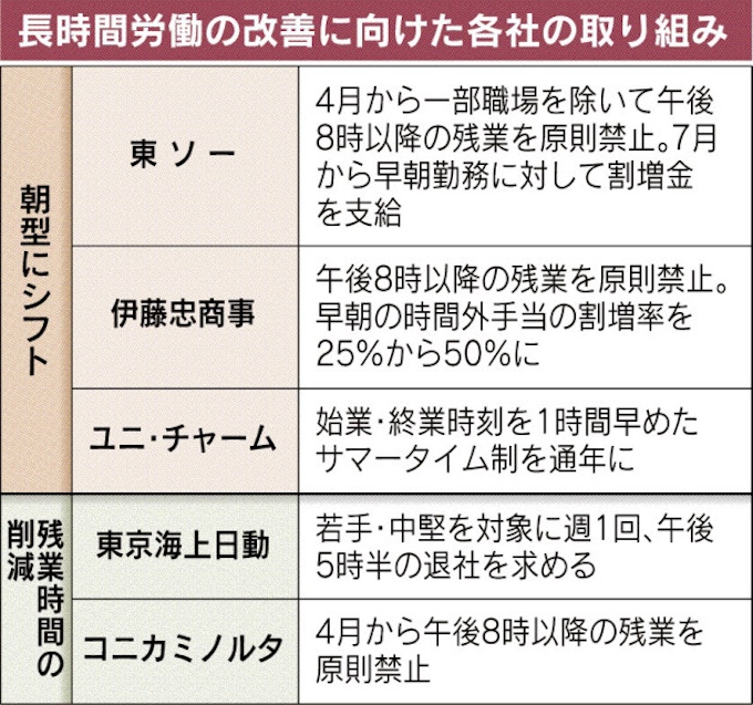 残業削減へ朝型勤務 東ソー 早朝は割増金 日本経済新聞